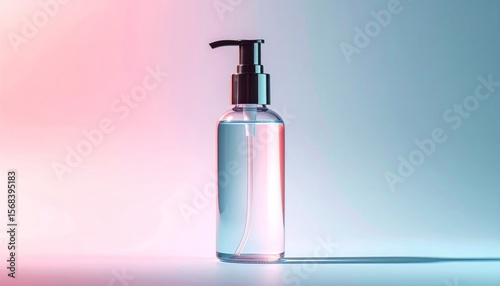 bottle, pump, dispenser, liquid, clear, transparent, glasses, container, cosmetic, beauty, product, pink, blue, gradient, background, studio, photo, clean, minimal, modern, simple, design, health care, hygiene, wellness, light, shadow, soft, pastel, colours, bright, object, still, life, cardboard box, marketing, advertising, commercial, corporate, cleanliness, health, care, personal, skincare