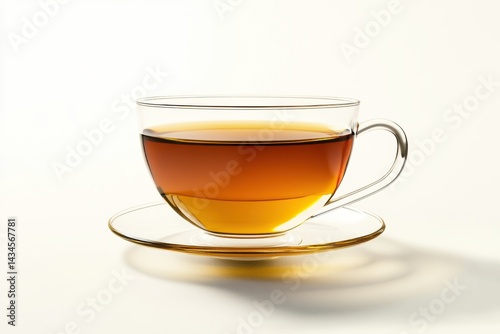 Clear glass teacup with amber-colored tea and rising steam isolated on white background