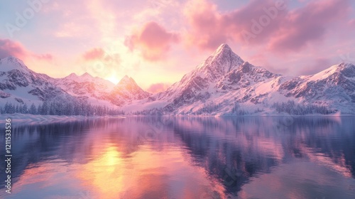 Clear lake surface mirroring snowy peaks under a breathtaking and colorful sunset glow