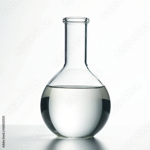 Clear liquid fills round bottom laboratory flask, isolated on white background. Essential piece of scientific glassware commonly used for chemical experiments, research, analysis in biology,
