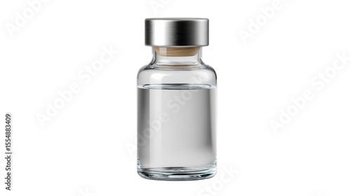Clear Liquid Vial: A pristine glass vial filled with clear liquid, sealed with a silver cap, suggesting purity and precision.