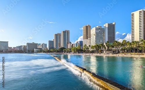Clear ocean water with a sandy beach full of palms surrounded by high buildings in Waikiki, Hawaii