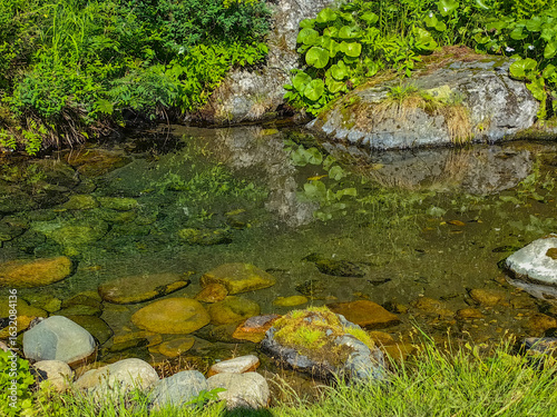 Clear pond reflects the surrounding nature, with rocks and lush greenery.