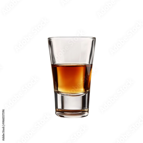 clear shot glass filled with amber colored liquor, showcasing its rich hue and inviting appearance. glass reflects light beautifully, enhancing drink allure and inviting enjoyment