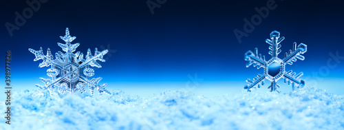 Clear snowflake crystal on sparkling snow. Cold or winter time concept.