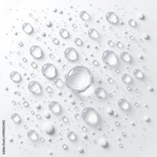 Clear water droplets of varying sizes scattered on a smooth white surface, creating a clean and refreshing visual pattern.