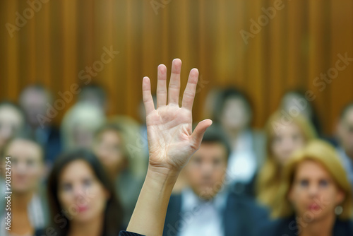 business, businesswoman, woman, unique, diversity, raise, raising, hand, colleague, work, job, talking, meeting, office, question, looking, working, workplace, clever, smart, innovative, closeup, executive, businessman, teamwork, corporate, professional, manager, standing, conference, success, crowd