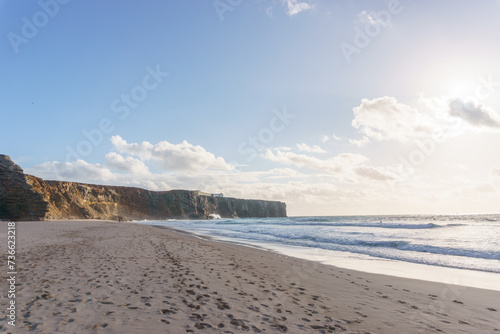 beach, travel, nature, algarve, portugal, ocean, tour tourism, water, landscape, sea, blue, coast, rock, sand, europa, sky, seascape, fort, landmark, panorama, shore, coastline, cliff, beautiful, vacation, atlantic ocean, bay, destination, formation, surfing, architecture, scenic, fortress, wave, surf, rocky, atlantic, portuguese, touristic, old, horizon, gold, sunlight