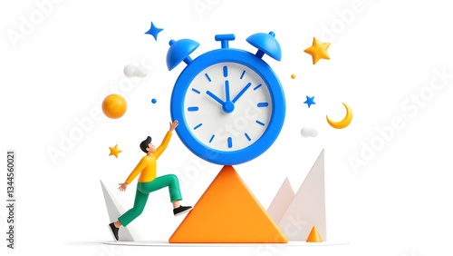 time, management, individual, growth, goal, setting, concept, effort, struggle, climbing, dream, hope, future, clock, blue, yellow, star, geometric, simple, illustration, creative, positive, upward