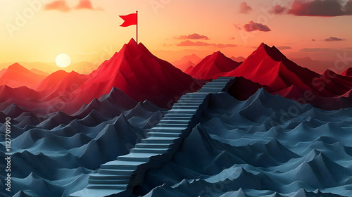 Climb the Steps to Success: Reaching Goals, Achieving Dreams, Mountaintop Victory at Sunset