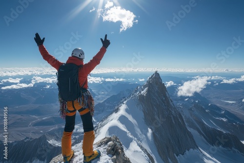 climber, mountain, climbing, summit, victory, adventure, high, altitude, snow, cold, weather, activity, hiking, expedition, nature, achievement, landscape, peak, sky, celebration, extreme, sport, trekking, ascent, performance, adrenalin, travel, exploration, journey, determination, freedom, breathtaking, view, rugged, terrain, athlete, challenge, disease, teamwork, mountaineering, scenic, beauty, bright, sun, clear, fresh, air, physical
