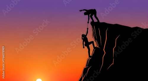 climbing, mountain, sunset, silhouette, teamwork, assistance, peak, challenge, adventure, sport, extreme sport, outdoors, nature, rock climbing, abseil, rope, support, success, achievement, motivation, inspiration, effort, perseverance, determination, partnership, friendship, freedom, exploration, dawn, dusk, colorful sky, orange sky, purple sky, landscape, elevation, summit, ascent, descent, cliff, rockface, hiking, trekking, expedition, guide, safety