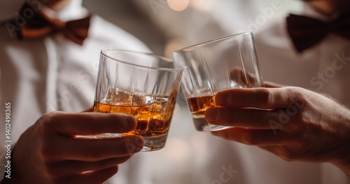 glasses, clinking, holding, amber, liquid, drink, celebration, event, formal, occasion, cheer, toast, beverage, ice, cube, hand, shirt, bow tie, wedding, groom, party, gathering, lifestyle, togetherness, social, sharing, closeup, detail, selective focus, indoor, celebratory, festive, enjoyment, alcohol, relaxation