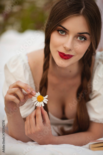 close portrait of a beautiful, laughing woman in a light dress holding a chamomile near her face during sunset, lit from the back