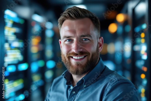 close, portrait, smiling, 40s, irish, male, information technology, men at work, camera, dark, server, room, blurred, background, happy, content, satisfied, joyful, professional, photogenic, confident, dedicated, network, technology, computer, laptop, cyberspace, datum, security, web, expertise, skilful, technician, information, system, engineer, developer, programmer, coding, techie, fixing, troubleshooting, repairing, hardware, software, maintenance