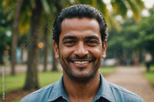 Close portrait of a smiling 40s Mauritian man looking at the camera, Mauritian outdoors blurred background