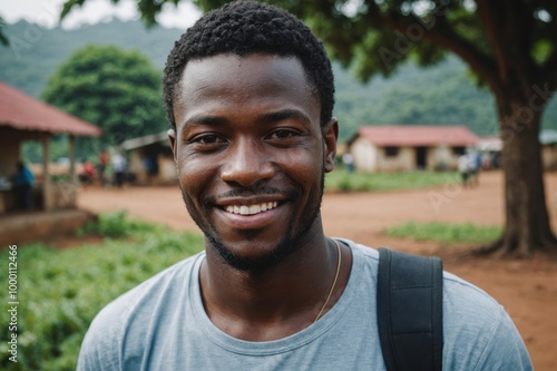 Close portrait of a smiling young Sierra Leonean man looking at the camera, Sierra Leonean outdoors blurred background