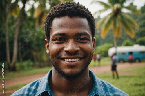 Close portrait of a smiling young Solomon Islander man looking at the camera, Solomon Islander outdoors blurred background