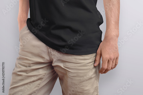 Close up a fragment of a black t-shirt on a slim young man. Frontal pose. Mockup can be use for clothing design.