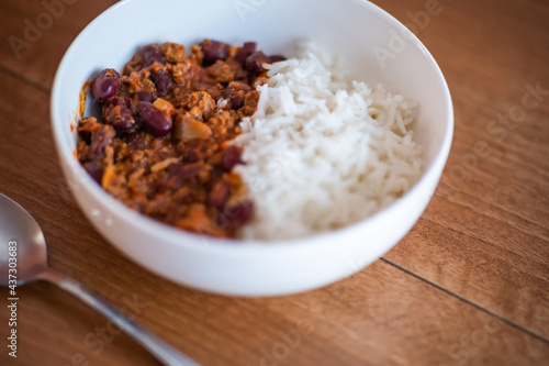 Close up and selective focus of meat chilli concarne and white rice in a white bowl on a wooden surface with intentional shallow depth of field and bokeh