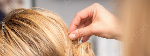 Close up back view of hand of female hairdresser makes hairstyle of young blonde woman in beauty salon