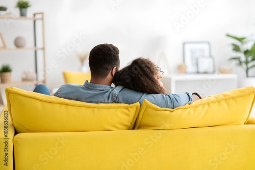 Close Up Back View To a Couple sitting on a Yellow couch PNG isolated on white background - couple Relaxing on a Cozy Sofa Casual home interior Decor