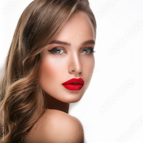 Close up Beautiful woman with red lips; make-up, hairstyle, fashion