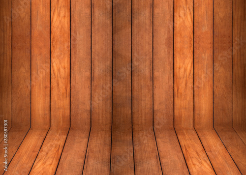 Close up blank curved teak wooden wall and floor background and texture.