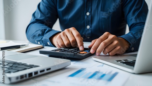 Close up businessman hand using calculator to budgeting and tax calculation monthly expenses. budget management and accounting on table. Business finance accounting banking concept.