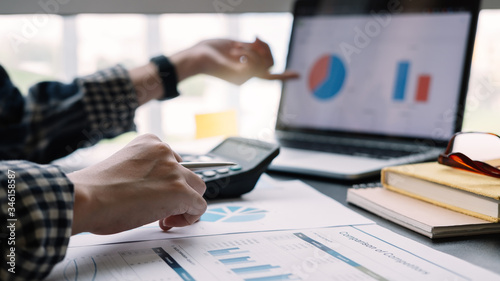 Close up, Businesswoman analyzing financial data on document and laptop computer screen