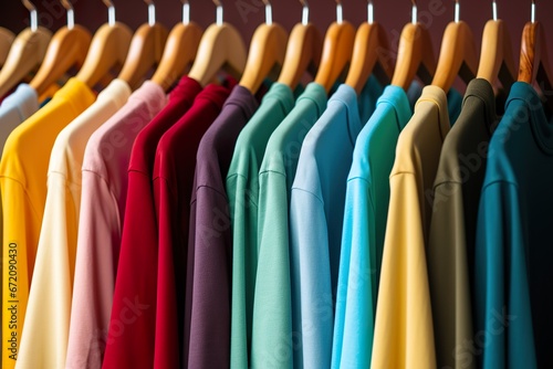 close up collection of colorful t-shirts hanging on wooden clothes hangers in the closet or clothing rack