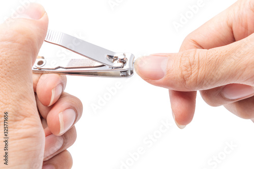 Close up cutting long fingernails and dirty using nail clipper, isolated on white background with clipping path, health care protection and cleanliness concept.