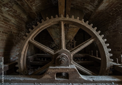 Close up detail of large weathered wooden gear mechanism inside a historic abandoned industrial flour grinding facility architecture ,factory ,industrial ,texture