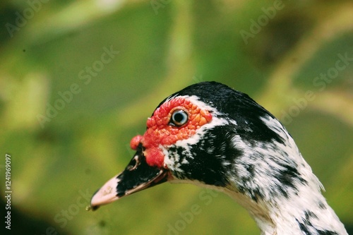 Close up detail of red face muscovy duck (Cairina moschata). Black and White Domestic Muscovy Duck.