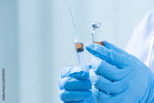 Close up doctor's hand holding medicine bottle and syringe for vaccine to patient on blue tone.Nurse using syringe are vaccination to patient for influenza protection.Medication treatment concept.