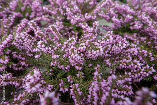 Close up flowering Calluna vulgaris, common shrub ling or simply shrub Selective focus of purple flowers on floral background in field