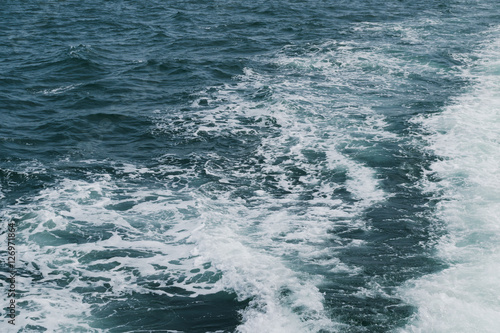 Close up foam wave on sea from boat. nature background texture for graphic resource.