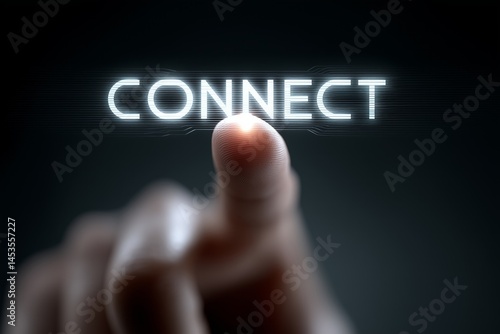 Close up front view of a hand touching a futuristic screen with the word connect displayed