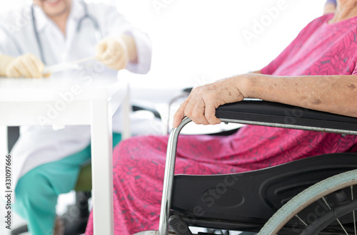 close up hand, old asian patient sitting on wheelchair, she talk about her symptoms with doctor in hospital, elderly healthcare promotion
