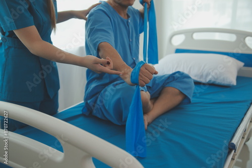 Close up hand patient doing stretching exercise with a flexible exercise band and a physical therapist hand to help in clinic room.