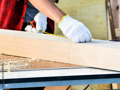 close up hands with white protective safety glove of carpenter working on the wood work and live streaming on social media