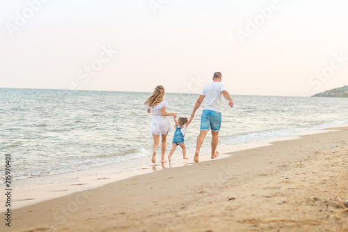 Close up Happy family of three - beatiful wife, father and daughter having fun walking on beach at sunset. Family traveling concept.