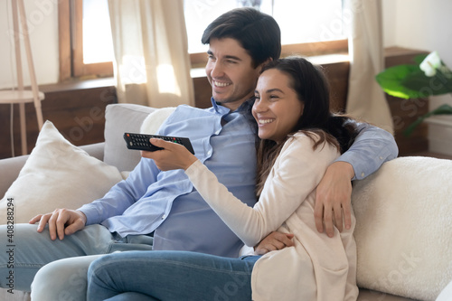 Close up happy young couple hugging, sitting on cozy couch, watching tv show or movie together, happy woman cuddling with man, holding remote controller, enjoying lazy weekend, relaxing at home