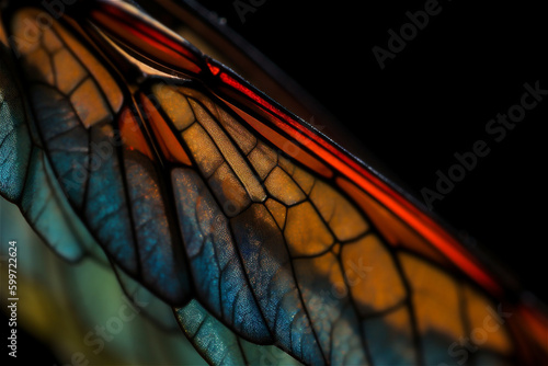 Close up image of a colorful dragonfly wing on dark background. AI generated content