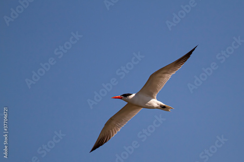 Close up, isolated image of a Caspian tern (Hydroprogne caspia) characterized by red bill, black legs and dark coloration at the tip of the wings and around eyes. Image was taken in Maryland.