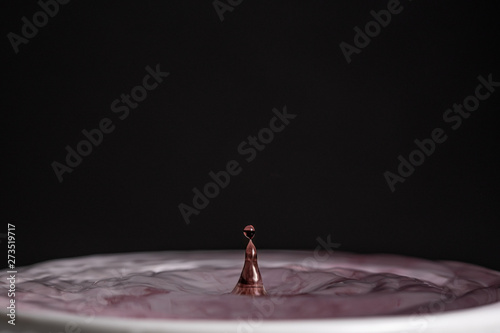 Close up macro photography of a purple water drop splashing into water with a dark colored black gray background