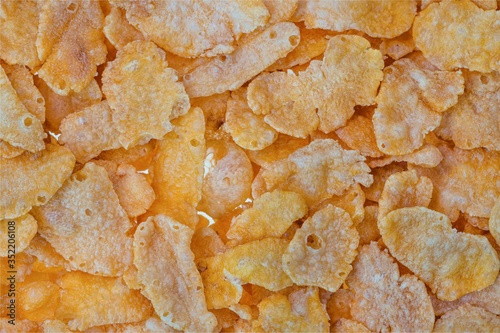 Close up macro view of cornflakes isolated. Beautiful healthy food texture background.