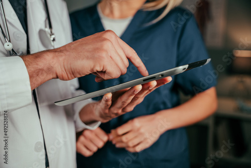 Close up male doctor typing on digital tablet