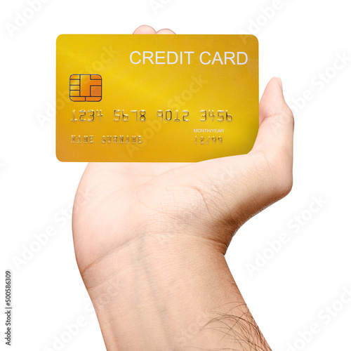 Close up male hand hold gold credit card isolated on white background with clipping path.
