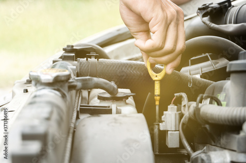 close up man checking the oil level in car engine